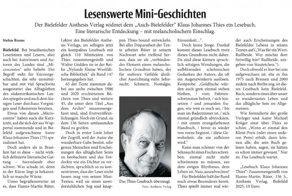 Als wir noch staunen konnten, waren wir klein und die Welt ganz groß. Jetzt erscheinen wir größer und die Welt haben wir schrumpfen lassen. Wäre es möglich, die Welt unzerdacht wahrzunehmen? Wahrnehmen beinhaltet die Wahrheit und doch hadern wir beständig. Der kindliche Blick muss nicht naiv sein, darf aber das Überstülpen des Eigenen gerne minimieren, damit nicht meine Wahrheit, sondern das Ersichtliche erfasst wird. Diese eigene Reduktion mit dem melancholischen Schalk hat Klaus Johannes Thies perfektioniert. Neu ist jetzt sein Lesebuch erschienen, das zusammengestellt wurde von Hannes-Martin Rüter. Für Leser, die diese Thies-Welt neu betreten, eine gelungene Einladung und für Kenner ist es eine Rückkehr in Bekanntes und Unbekanntes.